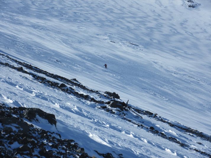 吉田大沢を登るKさん、風で雪煙が舞っている