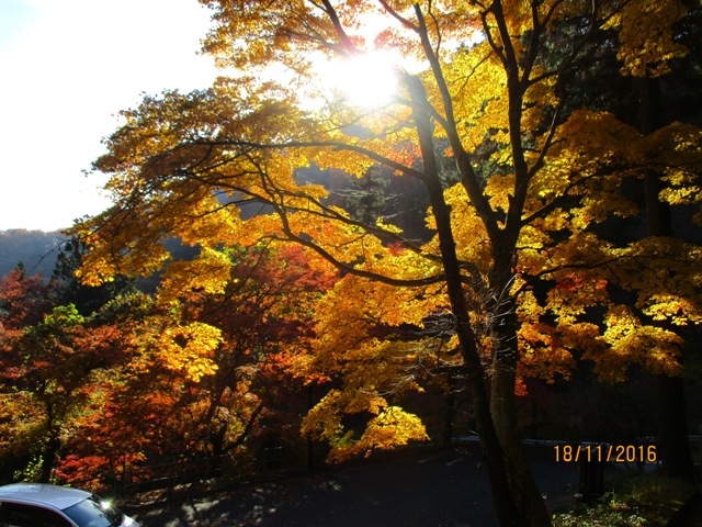 黒滝不動寺P着、モミジの大木が朝日に輝いていました