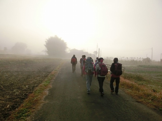 バス下車、朝靄の中歩きだす