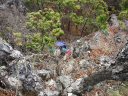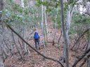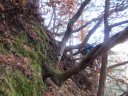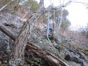 | 【期日】2016年11月20日 【メンバー】CL M/S M/S(会員外) 【コースタイム】赤岩橋7:30→狩倉尾根取付地点7:40→狩倉尾根主尾根上9:00→ 1450mピーク10:50→ 狩倉岳頂上12:00→狩倉槍ヶ岳13:00→狩倉岳14:00→ 1450mピーク15:15→赤岩橋17:20 【コメント】ほとんど踏み跡すらない山だった。取付地点も方角だけを頼りに尾根を上り詰めていった。途中にあった廃墟の痕跡と色あせたビニテープだけが正しい尾根であることを教えてくれる。1450mピークの手前で大岩に遭遇。コケだらけで正面からは登れそうもないと思い、巻き道を探し右側から岩登りにトライするが、岩がもろく危険なため途中であきらめて戻る。次は左側からトライするが、ここも登れるような斜面ではなかったが、途中で引き返すこともできず、木につかまって登る。結局、帰りにわかったのだが正面突破が正しかった。思わぬところで時間がかかったため、両神山までの周回はあきらめてピストンに変更する。 狩倉岳の頂上には石柱があるだけだった。せっかく来たので狩倉槍まで足を延ばすことにした。 しかし、登りも恐ろしいくらいの急登であったがその下りの大変なことは言うまでもなかった。帰途は途中で暗くなりヘッドランプをつけての下山。尾根をはずさないように慎重にルートを見つける。 ほとんど木登り、木をつかんでの下山だったためか、下山してから腕がだるくて、まるでジムに行ったみたいな気がした山であった。このコースの下山は二度としたくないと思った。 必ず、周回することをお勧めします。 コメント M/S |