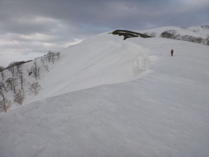 崩れた雪庇の先には笹薮が