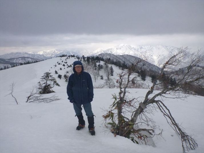 御前岳山頂、白山を背景に、山名板はこの木に