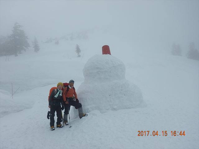 西穂山荘の雪だるまの前です。思ったよりも早く着きました