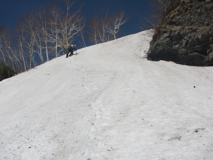 25雪壁をクライムダウンして急斜面で一休み
