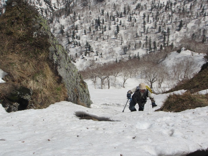 27中天狗の雪壁・急斜面を登る、肝を冷やした雪溝のところ