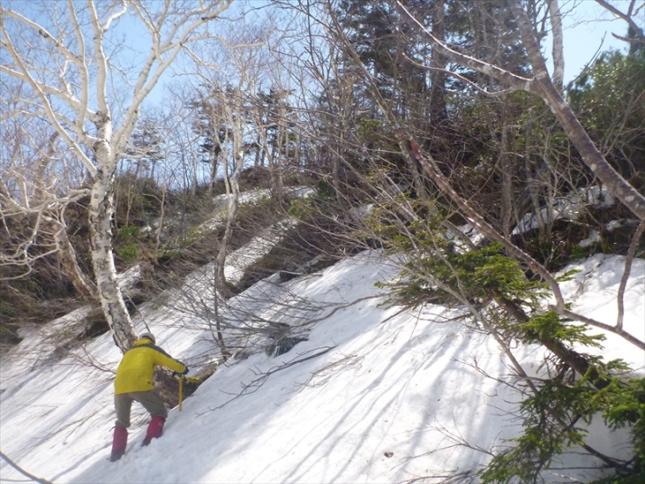 39槇柏山頂上へ薮をよけて雪壁に、ピッケルで確保しながら