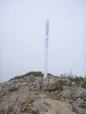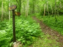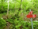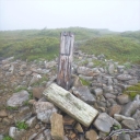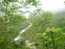 | 天塩岳ヒュッテを車で出て2分ほどで新道登山口に着いた。登山口には「新道登山口案内」があり、樺の白肌が目立つ登山路は緑に囲まれていた。昨日の雨、今朝までの霧で登山路に茂る笹、ヤチブキ、ヨブスマソウに露がついて靴・スパッツ・雨具を濡らす。 なかなかの急登りもあるので肌からも雨具が濡れた。登山路は次第に狭くなるが平坦となる。木々に囲まれて展望はない。尾根に出るとオオカメノキ、ミヤマエンレイソウ、サンカヨウやツバメオモトなど晩春の白花が続く。尾根の小木林帯に紫花のエンレイソウもあった。白花と紫花の延齢草が混在するのを見るのははじめてだ。 新道・旧道連絡路分岐には「新道から天塩岳へ」の道標がある。茨城の男性の情報では行者大蒜があるとのことだった。目を凝らして探すと幼い個体がぽつぽつ見受けられた。摘むには心が痛む。10分ほど休憩して円山へ向かった。薮で囲まれた登山路に雪が残っており、予想外れでびっくりした。霧で高木から滴が落ちて下草を濡らしているせいか足元から蛙が飛び出した。全体的には暖かいのだ。ウコンウツギの花を見つけて喜ぶ。流れる霧が薄くなったのかようやく太陽が朧に見え始めた。がすぐに光を失った。左右から登山路にかぶさるミネザクラ(チシマザクラ?)は満開で花弁や若葉に霧滴を乗せていた。このあたりの登山路の脇にショウジョウバカマが咲き始めていてようやく雪解けしたことをうかがわせていた。 ハイマツ帯に入ると左右にミツバオウレンの花が続く。登山路はガレ道に代わり、広い場所には積み石(ケルン)道標があった。標高点1317mを過ぎて20分も登ると 円山の山頂(1433m)に着いた。山頂杭が立つが添えられた山名板も風雨によって褪せて何も読めない。ハイマツの中にすこし高そうな地点があるが広くて平坦な頂上部がある山なのでどこが頂上かにこだわることはない。霧で展望がないので少し休んで下った。 コルを過ぎて数分歩くと三角屋根の避難小屋に到着した。「西天塩への踏み跡があるのではないか」とのQさんの一声に応えて避難小屋(公衆便所側)の裏に回ると笹薮に広幅の切り開きが西天塩岳に向かって伸びていた。霧のせいで頂上は見えない。4分も登ると笹薮切り開きは残雪に消え、残雪斜面の右上はガレ場になっていた。スプーンカットの固い残雪斜面を登りガレ場の岩を踏んで登ると左から延びてくる尾根に会いペイントマークを見つけた。ペイントマークに導かれて西天塩岳山頂に着く。山頂尾根の西300mに標高点1465mがあるはずだがそちらへ進んだ踏み跡を見つけることができなかった。いつものように頂上で小休止して行動食を取る。やはりここでも薄霧のせいで展望がなかった。 西天塩山頂からペイントマークに従って尾根を下る。マークは尾根筋を先に続いているが左折して往路のガレ場、残雪斜面を下り切り開きへ下った。切り開きにはエゾイチゲ(ヒロハヒメイチゲ)の群落が太陽に向かって白や薄紫の花を開いていた。切り開きが無かったらこの笹薮をかき分けるのに何時間もかかるだろうと話し合いながら野鳴ったら避難小屋に帰って来た。切り開かれた方々に大感謝である(Qさんにとっては西天塩岳に登るのが今回の目的であった。こんなに楽々達成では「許せない」のでは・・・・ 避難小屋からも天塩岳に向けて笹薮切り開きが続く。路傍は萌え出したばかりのヒメワラビやマイヅルソウの群落、ゴゼンタチバナなどで飾られていた。右手(南)に切り開き道が分かれている。少し入ってみると先に霧のベールをまとった西天塩岳が見えた。西天塩山頂からのペイントマークはこの切り開きに繋がっているに違いない(下山後登破した男女からこれを確認)。登山路に距離標を認めるとすぐに湿ったコルとなる。水たまりが続き、いくつかの水たまりにはにオタマジャクシが塊になっていた。霧雲を通して照らす陽光が暑い。背後の西天塩岳も前にあるはずの天塩岳も霧雲の中の中にあるので足元の季節の花を探すのが楽しみになる。 標高点1396mから天塩岳の山腹を登る。ミヤマキンポウゲの黄花を撮影し落花時期のキバナシャクナゲには落胆して蕾のイソツツジやコケモモやまだ葉だけのクロマメノキには「これからだ」とつぶやいて霧の中を天塩岳山頂に向かった。左周回をしている人たちとすれ違い始めた。 天塩岳(1557.7m)山頂には立派な御影石製の山名杭が立つ。少し離れた場所に三角点標石がある。すこし埋もれているがこれも立派な一等三角点である。大雪山連峰を展望できるのを楽しみにしていたが流れる霧雲が天塩岳山頂部だけ覆って何も見えなかった。残念ながら記念撮影をしただけで前天塩岳へ下った。 天塩岳頂上細尾根を進むとコルになる。踏み跡が尾根道と尾根東側巻道に分かれているが迷わないように尾根道を進んで滝上町分岐に着いた。先ほどの尾根東側巻道は分岐と合流することなく滝上町に下っていた。巻道に騙されないことだ。分岐からまずハイ松の間