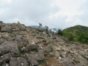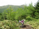 | 【期 日】 2017年6月27日(火曜日) 【メンバー】 CL:I/K T/K N/M M/I C/K 【コースタイム】 新座駅集合5:30→所沢IC・・・・・小諸IC→地蔵峠駐車場8:10 地蔵峠駐車場発8:20→中分岐8:50→鞍部9:22〜34→烏帽子岳10:28〜40→鞍部11:15〜25→ 湯の丸山南峰12:10〜18→湯の丸山北峰12:28〜55(昼食)→角間峠13:29〜40→角間山14:17→ 角間峠14:30〜45→九十番観音分岐14:55→猿飛佐助修行の地15:10→湯の丸角間登山口15:51→ 地蔵峠駐車場着16:27 【コメント】 「夏山に向けてロングコースを歩こう」を目的に「烏帽子岳〜湯の丸山〜角間山」を歩くことにしました。所要時間は昭文社2017年度発行版によると7時間40分です。ワー!大丈夫かな〜?休憩入れると8時間半は掛かるかも・・・。 さて、どうしょ〜?いや、大丈夫でしょ、いざとなったらどっからでも下山できるし・・・と覚悟の上で出かけましたが、当日は嬉しいことに予想以上の好天となり、八ヶ岳は勿論、遠くはまだ雪の冠った北アルプスなど・・・、しかもレンゲツツジはオレンジ色した花園のような咲き振りで、それに加え足元は、イワカガミやスズランなど・・・沢山咲いていて、実に良い日に来たものだと嬉しくなってしまいました。烏帽子岳に来たのは14年振りです。素敵な山です!湯の丸山は今年2月スノーシューで来たばかり。丸くて、広くて、岩だらけ。展望は抜群です!あの時、あと少しで山頂だったんだ〜、と、山頂僅か手前に立っている松の木を見て驚きました。あの木の下で、四阿山・根子岳を眺めたことを思い出します。 いつ来てもいい山だと改めて思いました。でも・・・暑いです!日陰もないので山頂での昼食を諦め、北峰で摂ることに・・・。角間山は目の前です。 ここからは未知の場所・・・。多少の不安を抱えながらも昼食後角間山に進みました。湯の丸山と違って静かな所です。誰もいません、私達だけ。でもレンゲツツジは満開。白樺もとっても綺麗!東屋もあります。振り返り見ると、湯の丸山と烏帽子岳が遠くに・・・・・・。すごいな!あんなに歩いてきたんだ!スゴいね・・・と皆で感心してしまいました。 角間山をピストンした後、鹿沢温泉方面に下山して地蔵峠駐車場へと戻ります。まだまだ2時間は掛かる。なのに既にPM 2時30分・・・。やばい!でも特に危ない所は無いです!再度確認してから高原のような爽やかな登山道を、レンゲツツジを眺めながら、足元の花を愛でながら、道を探しながら、山を眺めながら、ハイピッチに進みます。 やっと国道に出たときはホッ!でしたが、予定の地蔵峠駐車場までのルートが良く分かりません(今年から廃道に?)。 2017年度版の地図に無い道を進むのは危険と思い、国道を歩くことにしました。40分以上は掛かるでしょう・・・(凹)。 さて、考えたことは・・・。運よく車が止まってくれ、地蔵峠まで運転してくださるIさんだけを乗せて頂き、ここで待つことにしました。ラッキーです♪ 暫くしてIさんの車が迎えに来てくれました。\(^o^)/\(^o^)/ 国道94号線沿いの湯の丸高原は驚くほどのレンゲツツジと、放し飼いにされた牛が沢山いました。いや〜、素晴らしいドライブコースです。 湯の丸は・・・やはり、いいですネ。 角間山までのコースは初めてなので不安がいっぱいでしたが、とてもいい所でした。もし行かれる人が居ましたら鹿沢温泉から地蔵峠に戻る下山のルートを良く調べていったほうがいいと思います。(I/K記) |