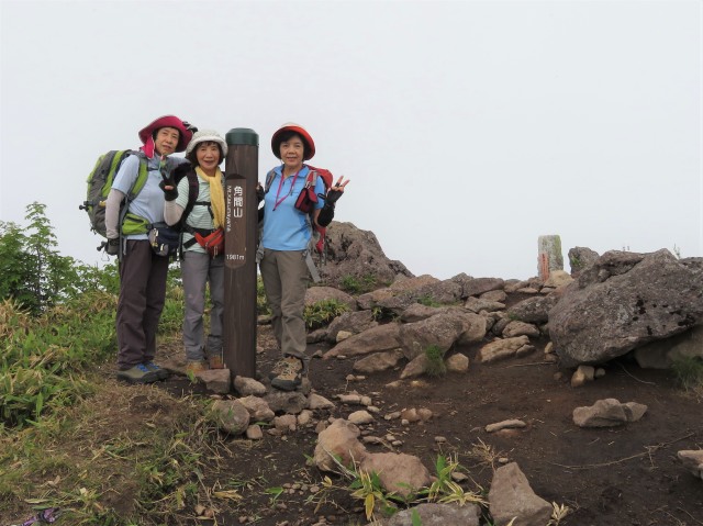 角間山に到着。三角点もあります。ちょうどガスって湯の丸が見えません