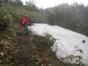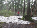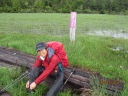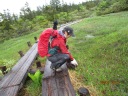 | 【期 日】20017年7月2日(日曜日・前夜発) 【メンバー】L:SN TK 【コースタイム】鳩待峠5:40⇒中原山(1968m)7:20⇒アヤメ平7:35⇒富士見小屋跡8:00〜8:10⇒白尾山9:20⇒セン沢田代⇒皿伏山11:05⇒大清水平12:05⇒尾瀬沼南岸分岐 ⇒尾瀬沼休憩所12:40⇒三平峠⇒一ノ瀬休憩所13:50⇒(シャトルバス)14:20発→ 大清水P14:40 【コメント】 尾瀬は若い時から色々なコースを歩いているが、アヤメ平は行った事がない。 Nさんがアヤメ平に行くというので「私も行きたい」と言ったのが運のつき?! アヤメ平〜富士見峠〜白尾山と皿伏山を越えて三平峠〜大清水に抜けるコースを歩くと言う。 この梅雨期に超ロングコースだ。歩き詰めでも8〜9時間。 富士見小屋に泊れば良いと思ったら、H25年に廃業したとネットで知る。富士見下の路線バスも昨年で運休。 大清水の路線バスの最終便の15:50に間に合わせて歩き、沼田に出る以外ない。 前夜川越発24:30の高速バスに乗車。戸倉〜鳩待峠の始発バスに乗換え、車中で朝食をすます。鳩待峠は風雨が強く天気予報とは違うが、梅雨時の山なので仕方ないか・・。 鳩待山荘の裏の急登を登ると、天空の草原がぱ〜っと広がる。 風で雲の動きが早く、時折雨も止み期待を持たせる。水芭蕉、ヒメシャクナゲ等湿原の花々が迎えてくれ、振り向けば残雪の至仏山。 吹く風は爽やかで気持ち良い。昔はこの鳩待通りが尾瀬のメイン通りだったそうだが、今は静寂の世界。 カッコウと鶯のさえずりのみが響く。 アヤメ平を過ぎ、眼前に燧ヶ岳がうっすらと見えてくる。 晴れていれば、燧ヶ岳を正面に池塘に映る姿を見ながら歩けるのにな〜と残念! 富士見田代から長沢新道の分岐があり、これを下れば尾瀬ヶ原の見晴十字路。 すぐに2年前廃業になった富士見小屋に出る。十字路になっていて、この分岐は要注意だ。 八木沢新道の方向に少し歩いた分岐を右に取り、広い砂利道を20分程登ると大きな反射板のある台地に着き、山道に入りだいぶ登ると白尾山の標識があるが、ここが山頂とは思えない場所で展望も無い。 次は皿伏山を目指すが、樹林の中に雪渓が次々現れる。 雨で雪が溶け泥沼のようになった道か、古い苔生した木道がどこまでも続く。 特に木道は滑り易く、怪我をしないように恐る恐る歩くので時間がかかる。 以前に木道で転び、あばら骨を折った経験があるNさんは濡れた木道がトラウマになっているようだ。 時々湿原が現れ気分が明るくなるが、また泥濘とぬるぬるの木道で、雨も降るし、時間も押してきて、水と行道食を口に入れ、ひたすら歩く。 昼食も摂れない。1時間45分程で皿伏山。 山頂らしくない樹林の中で、標識が無ければピークとは分らない。 誰一人会わない原生林だが、赤テープや木に印が頻繁につけられていて、このテープが無かったら、確実に迷いそうで、とても助かった。 このあたりは熊の好物のネマガリダケの宝庫で、「熊さん出ないで」と願いながら歩く。 尾瀬沼が見えてきてホッとする。休憩所もあり、尾瀬沼を眺めながら一服したい所だが、最終バスの時間を考えると、トイレを借りただけで、すぐに歩き出す。 湖畔からは新しい木の階段や木道になり、久し振りに登山者にも会う。 三平峠がどこかも分らずに通り、疲労困憊しながらも登って下って、やっと広い林道に出て「一ノ瀬」のバス停が目に入った時は安堵した!白いワンボックス車が停まっていた。 Nさんが大清水行きのシャトルバスかもしれないと大清水まで乗せて貰えるのか聞くと「OK、700円です。14:20の発車」との事。 今13:50、あと1時間林道を歩くはずだったので、救いの神だ!! ベンチに腰かけ、やっと昼食のおにぎりを一個食べられた。雨はあがっている。 どろんこになった雨具類を脱ぎ、車で予定より早く大清水に到着できた。ヤレヤレ・・。 「70ン歳の女性が雨季に計画する山ではないね。2度と行きたくない」と私が言うと、さすがのNリーダーも同感のようで「良く歩いたね」とねぎらいの言葉? 夜行で一睡もせずに、雨の中、二人共悪路をろくに休まず8時間強も良く歩いたものだ。 でも、未知のアヤメ平は素晴らしい天空の湿原だったし、白尾山〜皿伏山の原生林を越えて尾瀬の広さを実感した山行だった。 夏のロングコースのトレーニングに充分なったかもしれない。 熊の餌食にならず無事に帰還できたのが何よりでした。 T/K |