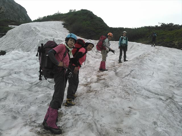 急な雪渓を抜け、ほっとしているところです