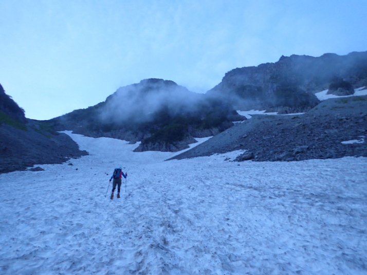 5.6のコルへ向けて雪渓を登ります