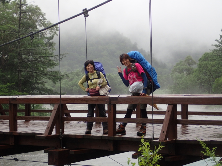 雨が止むのを待ってやっと出発、河童橋にてお決まりの記念撮影