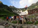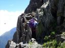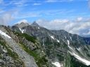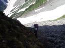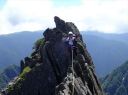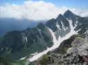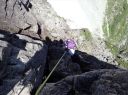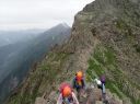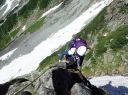 | 涸沢のモルゲンロード 【 山 域 】 北アルプス 北穂高岳 3106m 涸沢岳 3103m 奥穂高岳 3190m 【 期 日 】 2017年7月30日(日)〜8月2日(火) 前日発 【メンバー】 L:S.A Y.I T.Y M.S 【コースタイム】 7月29日 新座14:00〜(車)〜18:00沢渡(泊) 7月30日 沢渡6:00〜(タクシー)〜上高地6:30〜横尾10:29〜本谷橋11:50〜14:30涸沢着(テント泊) 7月31日 東稜班 涸沢5:20〜6:40南陵と東稜への分岐点〜8:15北穂東稜線〜10:20ゴジラの背中央〜 10:50登攀終了点〜12:00北穂高小屋(泊) 南陵班 涸沢5:20〜10:00北穂高岳山頂〜北穂高小屋(泊) 8月 1日 北穂高小屋5:00〜8:00涸沢岳〜9:30奥穂高岳〜奥穂高岳小屋11:45〜14:00涸沢小屋(泊) 8月 2日 涸沢7:00〜9:30横尾〜14:00上高地〜(タクシー)〜沢渡〜(車)〜新座 【コメント】 A&Sの室内クライミング師弟コンビでの北穂高岳東稜登攀です。 前日とは打って変わった素晴らしい天気の中、南稜班2名に先行し、分岐点を過ぎた地点で朝食をとり 登攀用具を装着しました。 緩い雪渓とガレ場を横切り東稜からの支尾根基部に到着、ここからは雪渓沿いの草付きを登り、 コンテで稜線直下まで、 さらにAがリードで岩を乗越し8:15東稜上に出ました。 一昨年に「新座山の会」A&O&Oトリオで登っているので、ここまではすこぶる順調で、Sさんも快適に登ってきます。 涸沢から見上げた全ての山々が望める絶景の地点で、奥穂高から吊尾根、 そして一昨日前半組のSさんと登った前穂高北尾根が良く見えました。 高山植物が咲き乱れる稜線を歩き、いよいよ岩稜です。 適当にコンテで登り、セルフビレイやロープ操作を復習しながら核心部・ゴジラの背中を通過していきますが、 すっぱり切れた岩壁のトラバースをしながらの岩登りで、 緊張、緊張でした。 定番の尖った岩稜上での記念写真を撮り、登攀終了点まで下降しますが、今回は別ルートをクライムダウン、 ここは練習の成果が出たところでした。 10時50分登攀終了、用具をザックに入れ北穂小屋まで嫌な登りを慎重に。 丁度12時に北穂小屋に到着し南稜班と合流しました。 (S.A記) 【北穂東稜を登って】