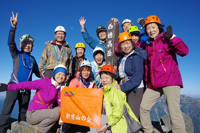 西穂高岳山頂、天候に恵まれ全員登頂の喜びがあふれる様!