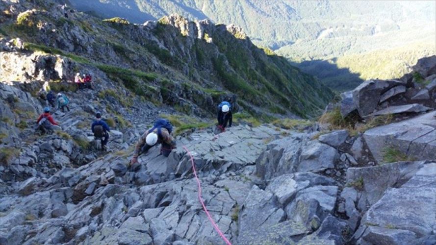 頂上直下のスラブ状はリーダーの配慮でロープが敷かれ、安全に下山を!