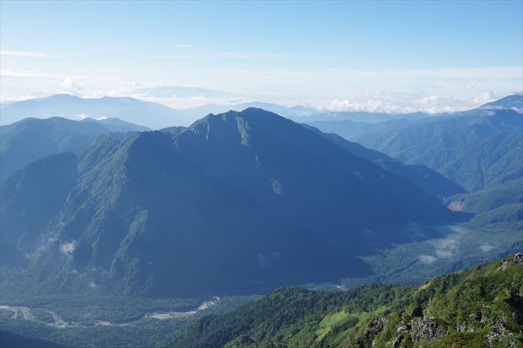西穂山頂からの展望 4/4、霞沢岳と梓川の流れ