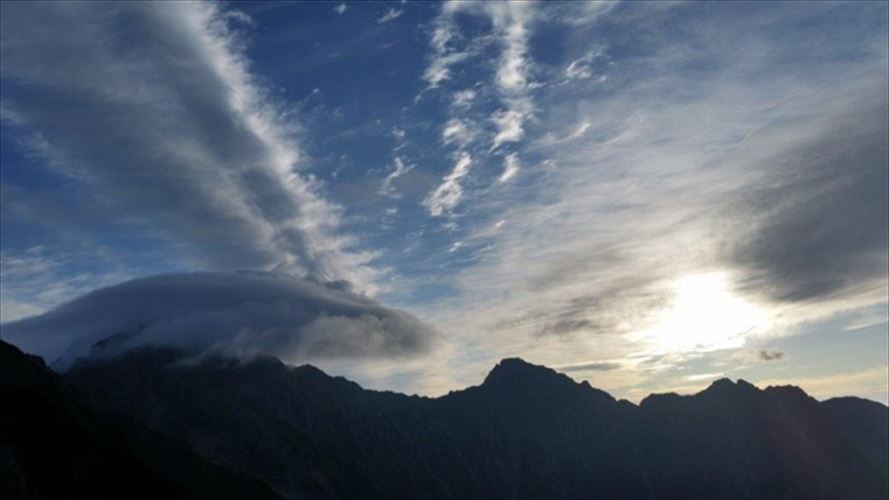 傘雲の覆われるジャンダルム、朝陽と共に青空が広がってきます。