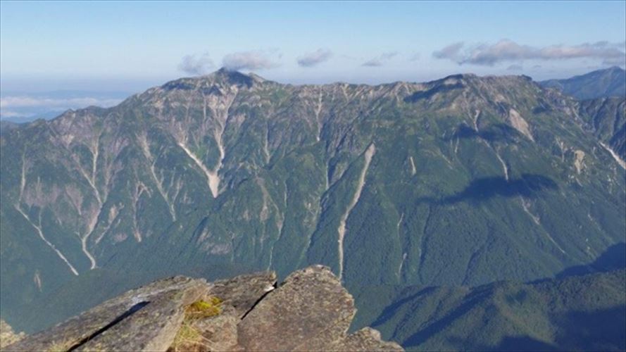 朝陽を受けて笠ヶ岳(2,897.5m)が美しく望めます。