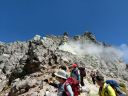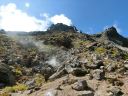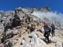| 【期日】2017年9月10日(日) 【メンバー】CL=K.Y SL=K.O S.N T.K I.K H.S Y.I M.I J.K E.O (10名) 【コースタイム】 西穂山荘発5:30―(0:15)―焼岳西穂高岳分岐5:45―(3:20)―焼岳小屋9:05― (0:20)―焼岳展望台9:25―(1:15)―焼岳山頂10:40―(2:45)―中の湯登山口着13:25―(0:30)―中の湯着13:55 【コメント】 西穂山荘を出発すると急な登り下りが続き、時折見える焼岳はとても遠く感じられました。焼岳小屋をすぎると荒々しい山頂が近くなり、硫黄の匂いがしはじめると噴煙をあげる黄色の火口を間近に見ることができました。 山頂の景色も素晴らしかったのですが、そこから少し降りて昼食を食べている時に見た、焼岳と青空一面の緑の笹がとても素晴らしかったです。 (EO記) |