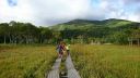| 【期日】 2017年9月13日(水)〜15日(金) 尾瀬 【メンバー】 CL Y/T Y/U M/S T/K 【目的】 草紅葉鑑賞とテント泊体験 【コースタイム】 一日目 柳瀬川駅7:00→関越自動車所沢インター→沼田9:30→戸倉駐車場10:30→鳩待峠登山口11:00 山の鼻12:30 二日目 山の鼻6:00→至仏山頂上9:30(休憩30)→見晴らし食事11:30→鳩待峠1300→山の鼻14:00 三日目 山の鼻小屋6:30→尾瀬ヶ原散策→見晴らし(十字路)10:30→山の鼻11:30 【コメント】 一日目 女性4人でテント食糧を担いで初のテント泊。リュックの重さも皆10キロ越え。 一日目の目的、とにかく無事テントを張ることなので登りなしの道を90分という短い行動時間で気楽に出発。平日でありながらも入山者はまあまあいる。やはり人気の尾瀬である。それでもピーク時のことを思ったら少ないほうなのだろう。テント場のある山の鼻小屋に着き、早速テント張りの準備。すでに2張りが設置されていた。適当な間隔を見ながら平地で石がないところをみて決める。分けて持ってきたテント道具を広げ組んでいく。先日の会山行でテントを畳むときにポイントを教えてもらったので思い出しながらやる。四人ということもあり思っていたより早くセットできた。テント張り大丈夫かなと心配しているKさんに無事、張られたことを報告するため記念写真を撮りメールで送る。初のテント泊で準備もでき食べていなかった昼食をとる。時間がたっぷりある。さて何をしようかと考えまずは、至仏山入口にある研究路を一周することにした。今年は、山の鼻付近でクマの目撃情報が多く寄せられているとのことで心配するが。山の鼻小屋の元支配人をしていた方がもう近辺で餌を食べつくし山に入ったからここらあたりは出ないという言葉を聞き少し安心する。しかし、研究路の木道にはクマの便らしきものを見つけギョッとする。それでも至仏山を眺めると青空が広がり、さわやか風が体の横を通り過ぎ大自然の中に身を置いていることの心地良さを満喫する。そして普通の山行では、行かないだろうビジターセンタに行き尾瀬のことを下調べ以外のことを教えてもらいながら翌日の行動参考にした。少し早いが早めの夕飯準備に取りかかり食べだすことにした。決めていたメニュー以外に持ち寄りもあり豪華な夕飯となる。時間がたっぷりあるので次回のメニューで軽くて簡単にできるものなどなど女性の会話は途切れることなく続いた。日のあるうちに片付けも終わりこれまた早いけどテントに入る。静かで程よく飲んだワインがきき皆18 時半に就寝。気心知った仲間とテントで過ごすのはなんとも寝るには、最適であった。 二日目 予定より早めの5時前に起床。夕飯の残りに具材を足しあったかい味噌汁を作りしっかり朝食をとる、昼食のためのお湯も沸かす。現地出発なので慌てることなく準備し出かける。荷物もサブバックで身軽さもあり軽快な足取りである。至仏山登山道に入るとすぐに滑りやすい蛇紋石がゴロゴロと連なっていた。前々日の雨で水がチョロチョロと石の間を流れていく。前日、研究路から至仏山の登山道を見ていると溜水に太陽が当たりキラキラと光、水があることはわかっていたが水のなかを歩くまであるとは思わなかった。数か所そんなところを超えたが全体的に登りやすいように石が階段のように並べてあったり木の階段になっていたりと整備されていた。階段が嫌だと思うこともあるが階段の間隔幅が自分たちには丁度良かったのか登りやすかった。高天ケ原あたりに行くと頂上付近が雲におおわれてしまった。頂上に着くころまでに晴れてくれればと思っていたが。残念ながら雲の中となる。昭文社の時間より 30分早く山頂に到着。昼食には早いのでしばしお茶をゆっくり飲む。その間ちょっとだけ雲が切れて尾瀬ヶ原が見えてあっと言うまに視界を雲で遮られた。気を取り直し小至仏山目指して進む。小至仏山頂上で山行の団体とすれ違う。その後からにぎやかな声が聞こえてきたかと思うと就学前の子供たちが次々と岩場を登ってくる。聞くと埼玉の鴻巣市の幼稚園年長さんであることが分かった。子どもたちもすごいけど引率する職員の方々も大変だろうと労ってしまう。今日の登山にあたり日ごろから練習をしているとのことだった。元気な子どもたちとすれ違い自分たちも先に行くことにした。下へ下ると至仏山は雲の中だが雲の下に来ると広い尾瀬ヶ原と燧ケ岳がきれいに見えた。雲の下はこんなに晴れているのにと山の空を実感。見晴らしの良いところで昼食をとる。すると先ほどすれ違った子どもたちのヤッホーという元気な声が次々聞こえてきた。小至仏山が目的のようだった。なら私たちは先に下りて出迎えてあげようなどと余計なお世話を思ったりした。鳩待峠に行く登山道は緩く下山しやすかった。遠くに白根山をみながら鳩待峠へと下りた。 後はテント場まで戻るだけなのでゆっくりお茶を飲みおしゃべりしていると「ただいまー」「おかえり」と元気な声。