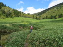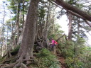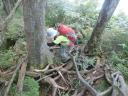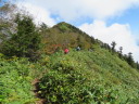 【メンバー】 CL:RK SL:IK HS YS 【コースタイム】 大橋登山口P6:24―古池6:50―新道分岐8:32―しなの木9:02―しらたま平10:02〜15―分岐10:30―黒姫山10:45〜11:00― 黒姫乗越11:53(昼食)12:20―峰ノ大池12:53―天狗岩13:47―笹ヶ峰分岐14:09―大ダルミ 14:30―新道分岐14:50―大橋登山口P16:00 【コメント】 黒姫山は2度目です。でもなぜでしょう、登った記憶がほとんどありません、この私にとっては不思議なくらいです。7年前の「山道」を読み返すと「展望は無かった」とは書いてありましたがただひたすら歩いていただけだったのでしょうか?実はこの日谷川岳馬蹄形に行く予定でした。台風の影響で急遽黒姫山に変更。記憶がないので新鮮と言うか期待は〇〇と言うか(スミマセン)・・・。それでも北信五山名峰です。皆気を引き締めて・・・★出発〜==! ルートは黒姫山大橋登山口からしらたま平を経て頂上へ。山頂からは稜線を北に下って乗越から折り返し、火口原に南下。ここからは登りルートとはガラッと雰囲気違う西登山道を経て戻る8の字周回ルートです。 いや〜登って驚き(*_*)です!実に素晴らしい山でした(*_*)!黒姫山のイメージが180度変わりました!実に大きな山です。展望も素晴らしく想像以上に厳しい山でもありました。目の前には迫るような高妻山・・・険しくそそり立つ戸隠山、その背景に北アルプス、槍ヶ岳の鋭鋒も見えます。素晴らしい眺めです。 山頂で休憩したあとは北方へさらに進み黒姫乗越まで急降下。藪漕ぎ、岩、木の根・・・気が休みません、実に大変でした。そこからUタウンして七つ池回り。ここは火口原で異次元の世界、素晴らしく美しい所でした。ですが・・・ここからがまたまた大変でした。西登山道は注意箇所多し、道とは言えないような岩だらけの道、沢、藪漕ぎ・・・。なんという道でしょう。でもそこをクリアすれば快適な道、戸隠独特のブナなどの自然の森との出逢いが待っています。 全行動時間この年齢にして9時間半掛かりました。万歩計を見るとなんと36,000歩。ウヒャ〜、私を除き3人は健脚者、付いていくのが必死でした。無理もありません、先頭がKさんです。あの「筋ツリ時代」は何処に行ってしまったんでしょう、とうにクリアしたようですね。黒姫山は私の「ロングコースベスト10」に入るほどの山でした。しかしこの山は変化のある自然多き名峰と言われるだけの美しい良い山でした。今回はしっかり目に、身に焼き付けた忘れられない山行となりました。Kさんに感謝です。(IK記) |