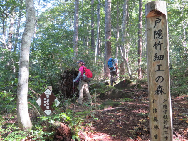 古池から「新道分岐」に到着。静かです。「戸隠竹細工の森」です