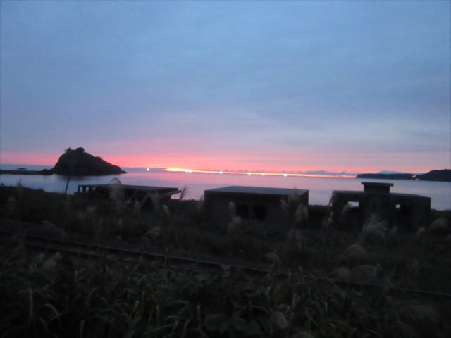 日本海の夕焼けと漁火、手前は五能線と番や小屋