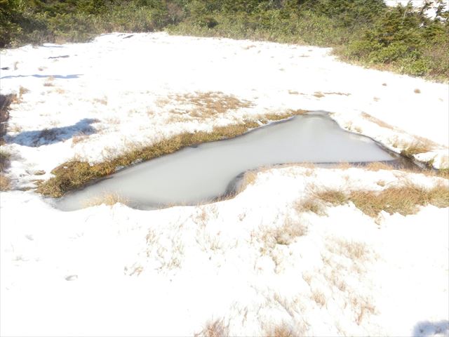 池塘が凍っていました。周りには雪が・・・