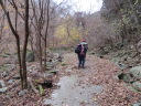 | 【期日】 2017年11月30日(木曜日) 【メンバー】 CL:Y/I T/K I/K 【コースタイム】サンスポーツランドP8:00~登山口9:00~西峰9:50~東峰10:20~登山口11:30(昼食)~阿唱念ノ滝入口12:45~阿唱念ノ滝 13:30~阿唱念ノ滝入口14:20~サンスポーツランドP14:30 【コメント】 物語山。なんと響きの良い名でしょう。この山名に魅かれいつか登ってみたいと思っていたが、その名には、豊臣秀吉の小田原攻めの頃、北条方の武将が落ち延び、岩の頂上に財宝を隠し全員岩上で自害した所がメンベ岩、物語山という名はこの岩の悲劇を元に付けたそうでちょっと怖いような伝説が残る山だったのです。それにしてもあの岩、どうやって登るのでしょうね? この物語山には西峰と東峰があります。西峰の方か眺めが良く、浅間山や妙義山など、上州の山々が見渡せ、予想以上に良い山でした。 AM6:00朝霞台を出発、空は今にも降り出しそう・・・。下仁田IC到着頃から空は明るさを感じ、時々薄日差すまあまあの天気になりました♪ サンスポーツランドに駐車し8時過ぎスタート。ここからまず林道を一時間程歩きます。林道は大雨の影響か?深く削れ落石も多くズタズタ、可哀想な道でした。所々道しるべなのか石仏のような石積みが・・・、このケルンが何となく心温まります。沢の水は冷たそう~、初冬の色合いです。荒れた林道を50分ほど進み沢を渡ると、待っていたのは!急登!石板状の崩れやすい岩、急斜面のガレ場、足元は枯葉に覆われ何処までも急登、鞍部に到着するまで気が休まりません。 鞍部に到着!まずは展望の良い西峰へ登りました。いい眺め!最高♪浅間山は真っ白!妙義は険しく見えその奥には草津白根山、等々・・・!なかなかいい展望です。東峰は三角点が・・・。こちらが本峰です。荒船山が目の前でした。 天気は崩れそうにないので下山後は阿唱念の滝に行きました。簡単に行けると思ったのですが予想以上に奥深く、道は枯葉に覆われ分かりづらく誰もいない静けさ。所々に置いてある石仏などが神聖で怖いようです。滝まで50分、やっと到着!滝は20Mほどの落差で水量はあまり無く、三方には不動明王の石仏、石碑、岩穴が・・・。じっと見ていると今にも修行僧が出てきそうです。 国道沿いからメンベ岩を再び眺めると、上州独特の奇岩ある風景と空気に改めて魅了されます。アカヤシオが咲く春はもっと魅了されることでしょう。こんにゃく観光センターでコロッケを食べました お腹が減っていたので実に美味しかった~!サクッと美味しい下仁田ネギ・味噌の味!西上州に行かれた時是非お立ち寄りしてみてはいかが♪ (IK記) |