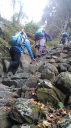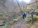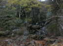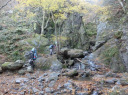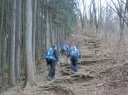 | 【期 日】 2017年12月4日(月) 【メンバー】 CL Y.S Kz.O 会員外3名 【コースタイム】 白谷橋登山口9:13?権次入峠11:03―棒ノ折山11:28―黒山12:26―岩茸石山14:05― 高水山14:39―高源寺14:59-軍畑駅着16:19 【コメント】 心配していた天気も日中は持ちそうな予報のなか、新座駅を出発して途中で会員外の方々と合流しバスに揺られてさわらびの湯に無事到着~!のハズでしたが、さわらびの湯入口でバスを降りずに通り過ぎるアクシデント発生!慌てて運転士さんに声をかけて少し過ぎた道の路肩でバスを降ろしていただけました。 【なんて良い運転士さんだ~でも、自分だったら降ろさないカモ( 一一)】 気を取り直して何とか白谷橋登山口から今日の山行をスタートしました。登山口からしばらくの間は、木立の中を上って行きました。だんだん水音が近くなり、やがて沢沿いのコースになり川を何回かクロスして進んで行きます。さらに進むと岩が迫ってくるゴルジュ帯と何回か現れる鎖場のあと林道にぶつかりそこにあった木のベンチで休憩しました。 休憩後歩を進めると景色が変わって周りに岩場が無くなり噂に聞いていたなが~い木段が続いて気が遠くなりそうでした。どこまで続くか永遠とも思われた木段(土が抜けていてもはやハシゴ状態)を登りきると視界が一気に開けて棒の折山頂に到着しました。気がつくと朝は出ていた太陽が雲に隠れて予報通りの下り坂の天気となってきました。そこで休憩もソコソコに次の黒山を目指して出発しました。黒山までは標高差50mですが、100m下って50m上がる感じで「あとは軽く下って稜線歩きで終わり」。くらいに考えていた自分は、このあと今回の縦走長丁場の辛さを思い知らされる事になろうとはこの時はまだ思ってもいませんでした。黒山で短い昼食をとり天気と時間を見ながら向った2つのピークはまるで水前寺清子の歌のような三歩登って、二歩下るみたいな稜線と次々と出現する木段を登って、足のもも筋をプルプルしながらやっと石茸石山に到着しました。ここは南東方向に展望がよく所沢・大宮方面や遠くスカイツリーもおぼろげながらのシルエットで望む事ができました。その後、眺望の無い高水山と紅葉が僅かに残っていた常福院を通過して暗くなる前になんとか軍畑駅に着きました。 今回、自身初めての電車で行く山行を経験して、車が無いとピストンをしない山の楽しみ方を教えていただきました。また、木段で足がつりそうになって、いよいよ自分もツムラの35億?のお世話になるのか?とも感じた山行でした。 Kz.O |