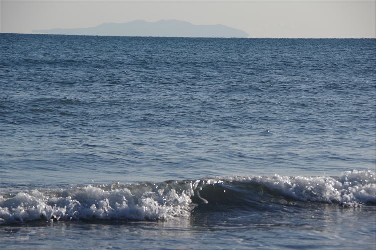 遠く大島の島影を望む由比ガ浜の海岸