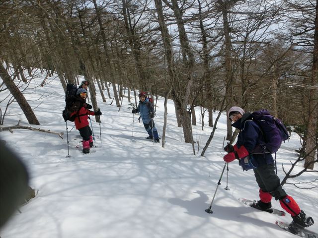ふかふかの雪面を、思い思いにスノーシューで進みます