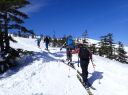 ここからの尾根は緩やかな下りとなり、先行者の滑って行ったシュプールやスノーシューの跡があるが、シールを付けたままでの滑走は慣れないと難しく技術の差が出るところでもある。もっとも5名中3名は75‐75‐71歳であるから転ぶのも止む負えずというところか。