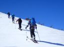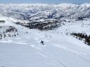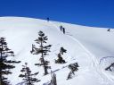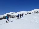 景色は最高、360度の景観であるが、時間が気になり早々と山頂を後にした。先ずは、広い緩やかな稜線を下り、前方の谷川岳連峰と目的の経由地点、雁ヶ峰を見下ろせるところからの大滑走となる。雪質は上々、思い思いに滑りこんだ。