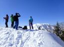 2パーティ5名のスキーヤーとボーダーが休んでいたので記念写真をお願いし、すぐ霧ノ塔へ向けて出発。まもなく霧ノ塔(1,994m)に到着、シールを外すと楽しい楽しい滑走の始まりである。