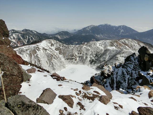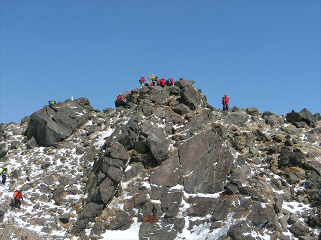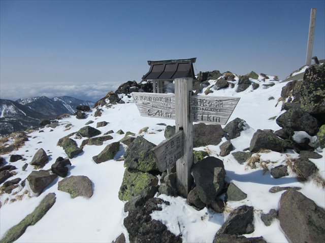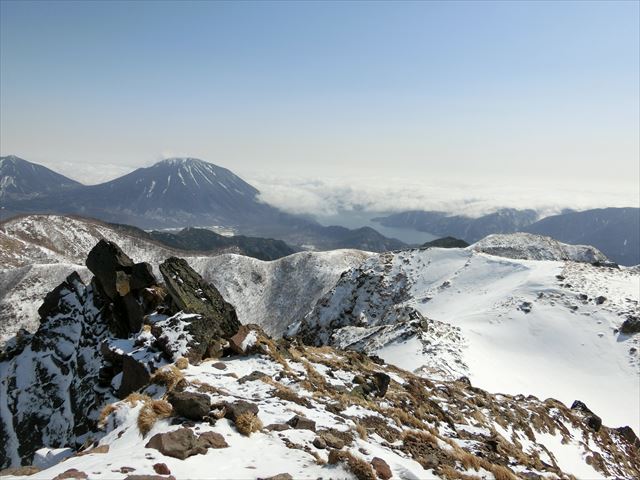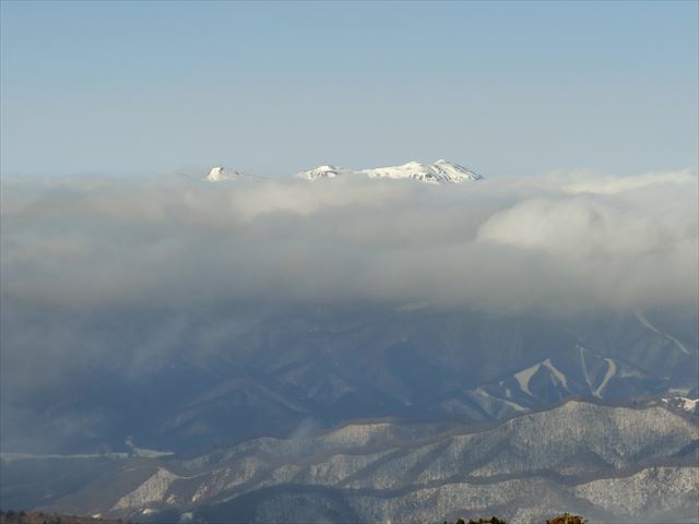 丸沼高原スキー場の駐車場に着くと、8時前にも拘らず、既にかなりの車が停まっていました。スノーボーダーが多かったですが、登山者もちらほら見受けられました。実際、山頂は記念撮影の順番待ちとなりました。ロープウェイは運転開始の15分くらい前から動き出し、標高2000mの山頂駅まで一気に登ります。 山頂駅横の見晴しからは、燧ヶ岳が見えました。