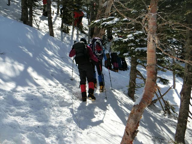 樹林帯の中をトラバースして歩きます。雪は締まっていて、歩きやすいです。樹林帯の中は、風もなく穏やかです。
