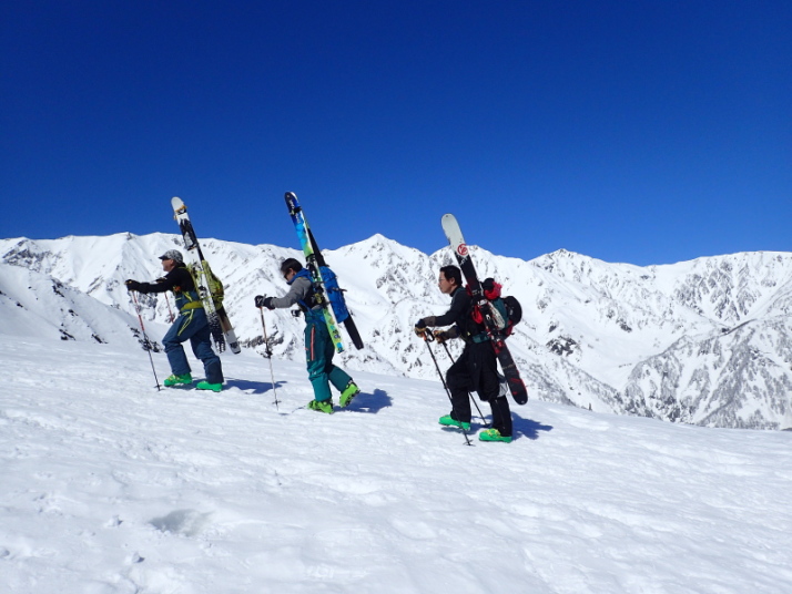 白馬三山を横に見ながらスキーを背負って登ります