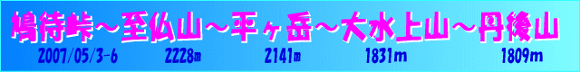 | 【山行期間】2007年5月3日〜6日 【山行目的】残雪期にしか縦走できない至仏山から大水上山までの群馬新潟県境の山を縦走 これまで3回 計画し、中止2回、悪天候でエスケープ1回の久恋のコース 【参加者】礒田ほか新ハイ4名 《コースタイム》 5月3日(木) 東松山 発 7:05 鳩待峠 着 9:35 準備 発 10:09 快晴 至仏山 着 13:45 発 13:58 標高1668m 南コル 着 16:34 所要/計画 テント設営 荷物整備 歓談 夕食 就寝 19:30 5月4日(金) 起床 4:30 朝食 標高1668m南コル 発 6:35 快晴 日崎山 着 8:18 発 ススケ峰 着 10:21 発 白沢山 12:55 平が岳 着 15:30 発 15:44 標高1950m斜面平坦部 16:20 #REF! テント設営 歓談 夕食 就寝 19:30 5月5日(土) 起床 4:15 朝食 準備 テント撤収 標高1950m斜面平坦部 発 6:15 快晴 剣ガ倉山 着 6:55 発 7:05 滝ガ倉山 着 ? にせ藤原山 着 11:46 発 12:06 藤原山 着 13:59 大水上山 着 16:55 丹後山 着 17:48 丹後山避難小屋 着 17:54 テント設営 荷物整備 歓談 夕食 就寝 19:30 5月6日(日) 4:30 起床 朝食 4:50 準備 丹後山避難小屋 発 6:20 曇り 分岐 丹後山登山口 9:21 十字峡 着 10:11 所要/計画 3:51 荷物整備 十字峡 発 10:30 畦地温泉 着 10:50 発 11:50 雪国観光C魚野の里 着 12:30 発 13:15 東松山駅 着 15:40 |
