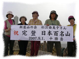 | 杉江由美子さんが日本百名山99座目(後方羊蹄山)と100座目(十勝岳)登頂達成を目標に計画した。 (往復とも羊蹄山真狩コース) 初日、後方羊蹄山は新千歳空港からレンタカーで2時間半、豊富な羊蹄の湧き水(カムイワッカの湧き水)を ザックに詰めて出発、蒸し暑さと標高差1500m、ひたすらの登りが待っていた。18時前に避難小屋に到着。 他の山と違って19時過ぎても登ってくる人、単独行の人が多いように感じた。避難小屋は清潔で快適だった。 寝袋は持参したので毛布だけ借りた。ストーブがあり寒くはなかった。 翌朝5時40分発、羊蹄山の火口壁到着6時前、時計回りに火口の淵を一周、一周5kmのほぼ半周したところに山頂はあった。 山頂到着6時40分だった。99座目に無事到達出来、少しホッとした。 山頂まで出会った人も少なく、雄大な景色をゆっくり堪能し、避難小屋に戻り朝食、下山したのは11時20分だった。 (十勝岳温泉の十勝岳・富良野岳登山口から十勝岳登頂、望岳台登山口への縦走コース) 美瑛町国設野営場出発5時、レンタカーで十勝岳温泉駐車場に移動、準備を整え登山口を出発したのは5時45分、 上富良野岳に12時までに到着できたら縦走することになっていたので、みんな少し緊張気味に出発。 天気は最高、景色も澄んだ空気の中、富良野岳への登りの途中から遠く十勝岳のツンと尖った頂が見えるようになった。 今日は全員快調な歩みで富良野岳には予定より大幅に早く到着。その後も順調に適度なアップダウンを楽しみ、 周囲の景色(ナキウサギの声も聞いた)を堪能しながら上富良野岳山頂へ。少し霧が出てきた。 上ホロカメットク山の山頂からは霧の中に十勝岳の山頂が浮かんでいた。 近づいた十勝岳山頂は直ぐ霧に隠れてしまった。なんとか十勝岳山頂だけは晴れて欲しいと願う5人の気持ちが通じたのか 十勝岳山頂直下の最後の登りに懸かる頃に一時、霧の中からその山容が浮かび上がり、みんなの足が速まった。 由美子さんの百名山完登、十勝岳山頂到達は12時45分だった。 内緒で用意した横断幕にしきりに「「恥ずかしい」といっていたが、周りにいる人たちにも祝福され、一緒に登った我々も 感動のお裾分けをいただいた。本当におめでとう! みんなの気がゆるんだせいか、横断幕をしまうころにはぽつぽつと雨、本降りの中の下山となった。 |