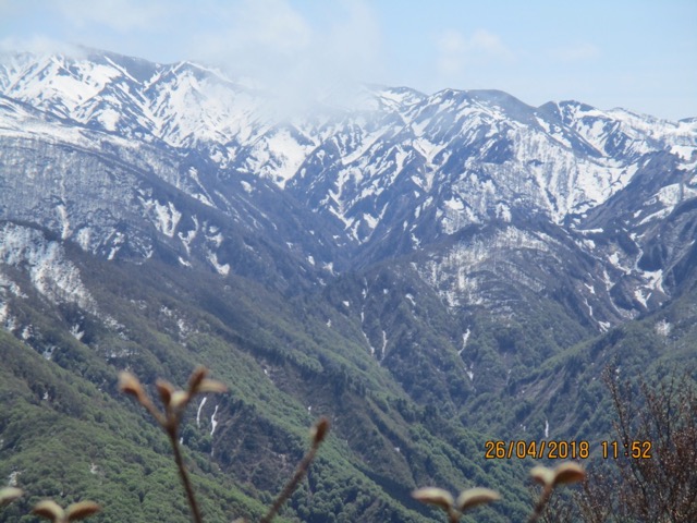 晴れてきた。残雪の山は越後三山か?