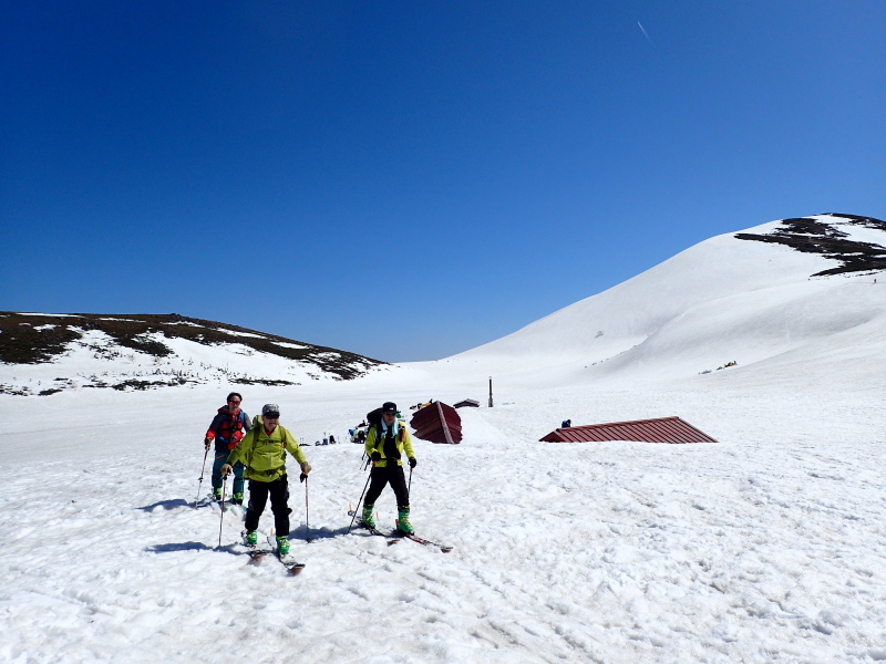 雪でほとんど埋まった白馬大池山荘の脇を抜けていきます