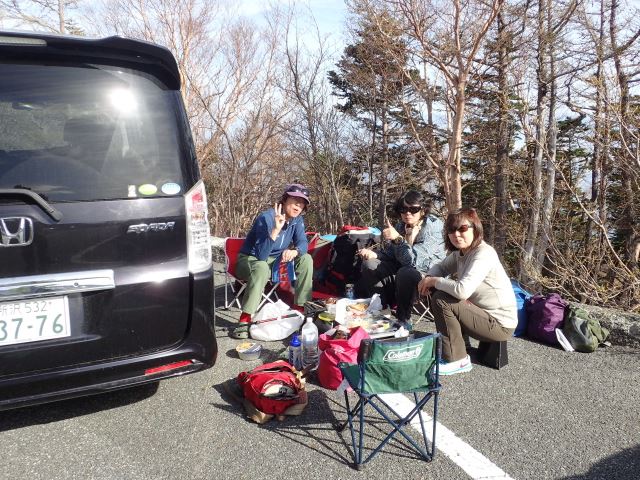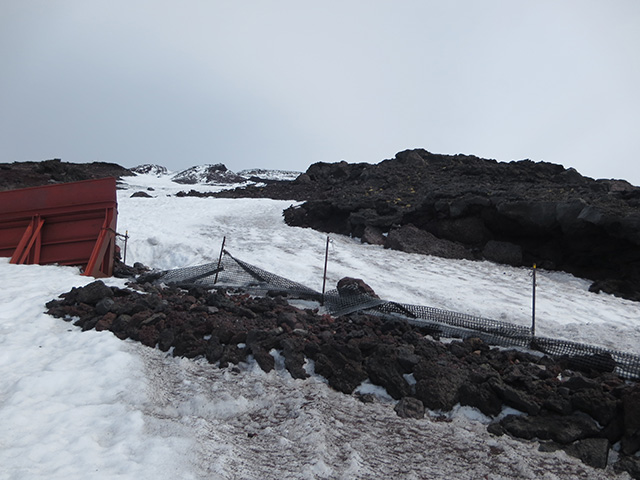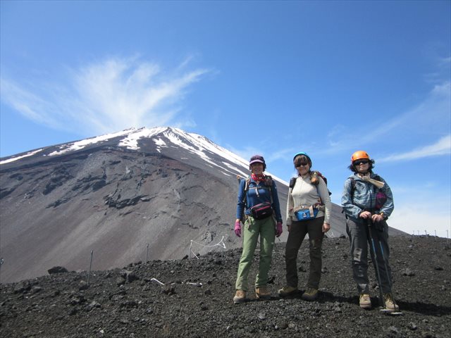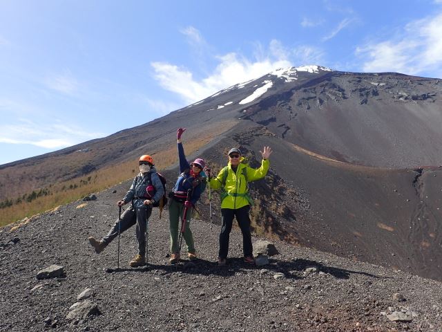 早朝に新座を出発し、お昼前には富士宮口五合目駐車場に到着。例年ならこの時期は、駐車場近くまで雪が残っているとのことでしたが、今年は雪が全くなかったので雪上歩行訓練を諦めて、宝永火口~宝永山を往復することになりました。