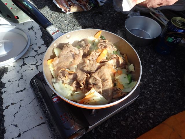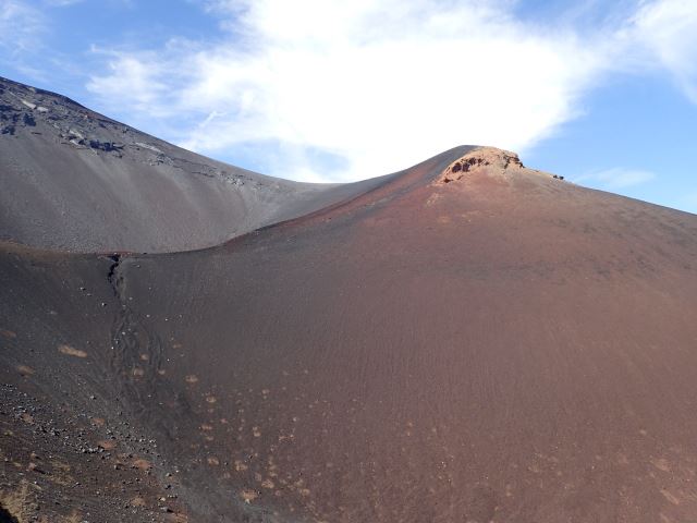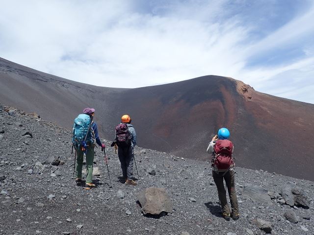 歩きにくい火山灰の登山道を進んでいくと、見たこともない景色が!赤茶色の山肌の宝永第一火口が現れました。一度火口まで下りて、今度は山頂までの登り返しです。宝永山山頂(2693m)からの眺めは素晴らしく、眼下にはひょうたん型の山中湖もハッキリと見えました。その後、第二火口まで下り、トラバースして駐車場に戻りました。早めの夕食を取り、明日に備えて早めにテントで休みました。
