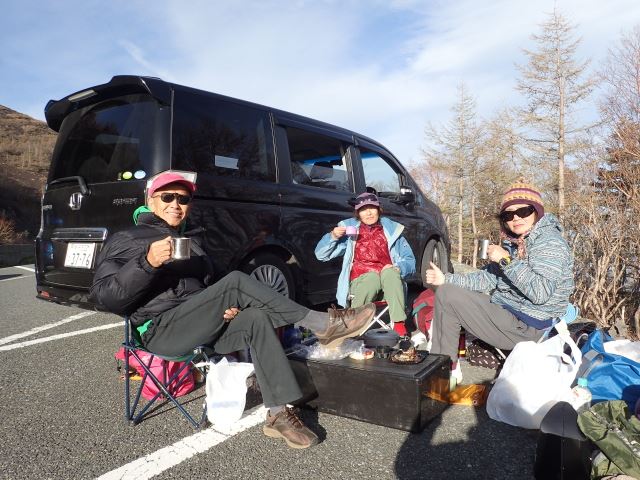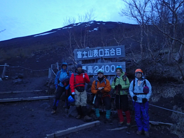 前日の18時00分に仕事を終えて、先発隊に合流するべく同僚の会員外と2人で出発して21時30分ごろ富士宮登山口の駐車場に到着しました。広い駐車場には数台のクルマがいましたがテントが横に張ってあるSさんのクルマを発見して合流しました。皆さんは既に就寝中でした(実際、Sさん以外はほぼ眠れなかったそうで。。)ので挨拶は後にして簡単な食事のあと車中泊としました。