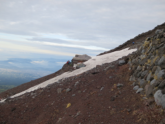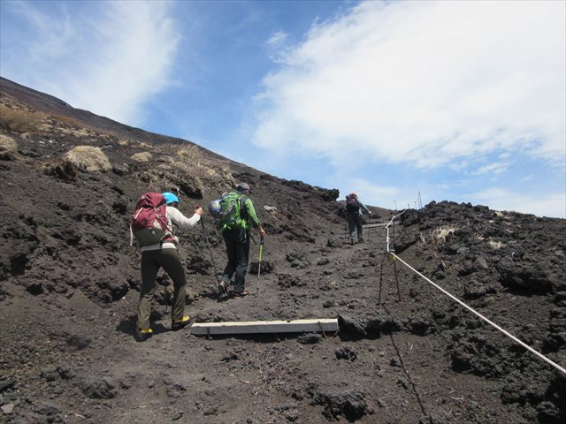 弱風のなか早朝に出発、順調に標高を上げて行き6.5合目あたりで17人の外人さんチーム(数名はスキー背負い)に、7合目で日本人2人行と単独行に抜かれました。単独の男性と話したところ、例年は6合目以上は雪があるが今年は全く雪が無いと話していました。