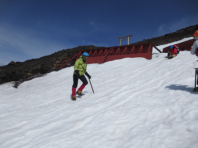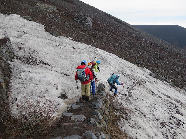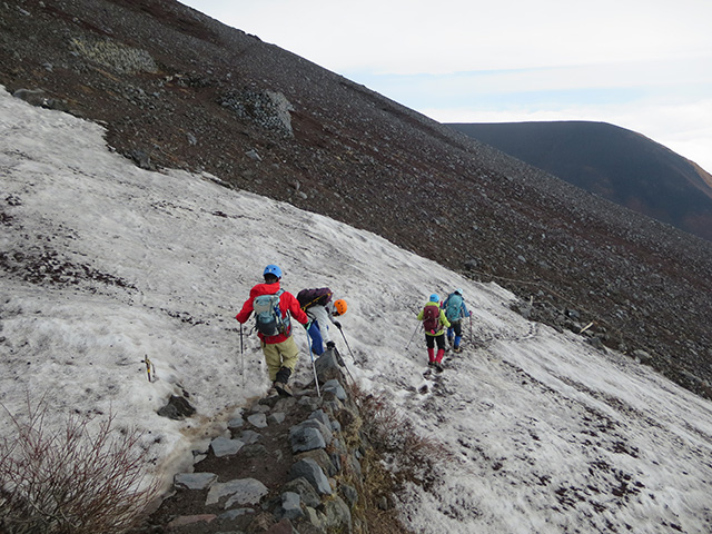 7合目を過ぎたころから西風が強くなり始めて、時折すすめる歩と身体が風で浮き上がるようになりました。8合目になるといよいよ先には雪渓が広がり、Sさんの指示でアイゼンを装着して出発しました。