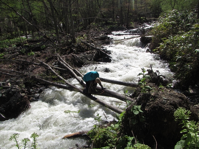 倒木に四つん這いになって沢を渡る