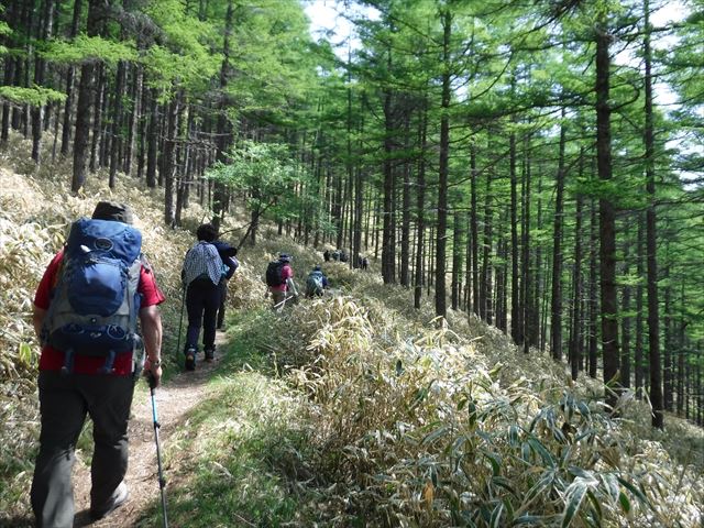 鳥の声?を聞きながらカラマツ林の中を歩く